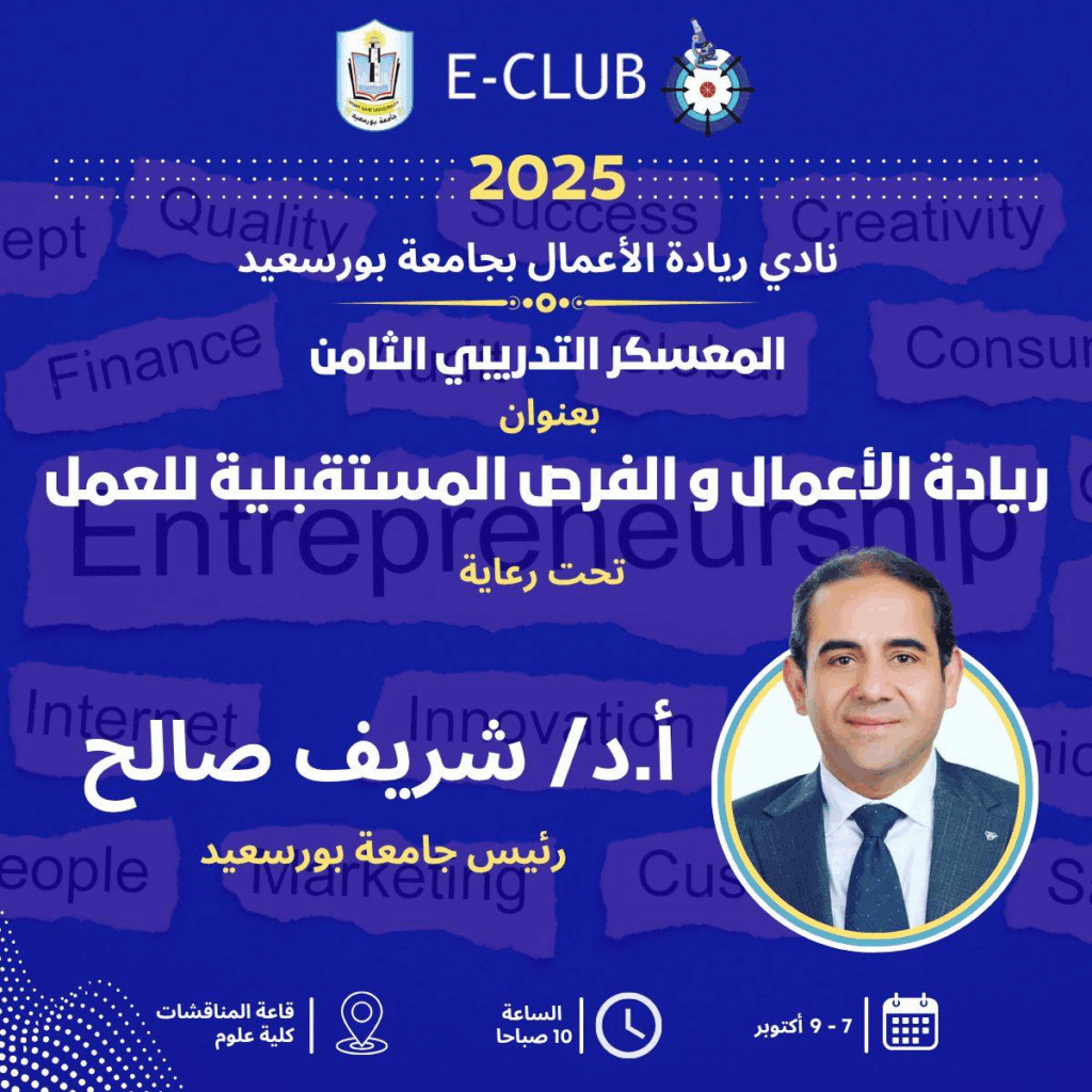 تحت رعاية معالي الوزير الاستاذ الدكتور شريف صالح رئيس جامعة بورسعيد ينظم نادى ريادة الأعمال بجامعة بورسعيد المعسكر التدريبي الثامن الفترة من 7 لـ 9 أكتوبر 2025 تحت عنوان : ريادة الأعمال والفرص المستقبلية للعمل. باشراف ا.د/ محمد رمضان عميد كلية العلوم ا.م.د/ محمد زين مدير نادى ريادة الأعمال بالجامعة المكان: قاعة المناقشات بكلية العلوم